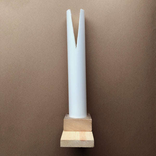The stand is clamped onto a table. Then one slips the Shibori cloth on and off the stand to create the appropriate tension when binding the cloth with thread. This stand can also be useful while stitching for various Mokume Shibori.